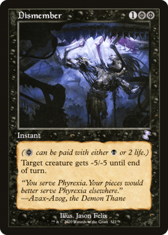 ({B/P} can be paid with either {B} or 2 life.) Target creature gets -5/-5 until end of turn.
