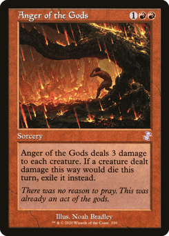 Anger of the Gods deals 3 damage to each creature. If a creature dealt damage this way would die this turn, exile it instead.