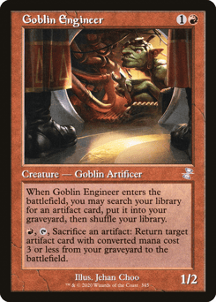 When this creature enters, you may search your library for an artifact card, put it into your graveyard, then shuffle. {R}, {T}, Sacrifice an artifact: Return target artifact card with mana value 3 or less from your graveyard to the battlefield.