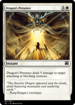Dragon's Presence deals 5 damage to target attacking or blocking creature.