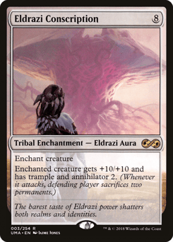 Enchant creature Enchanted creature gets +10/+10 and has trample and annihilator 2. (Whenever it attacks, defending player sacrifices two permanents of their choice.)