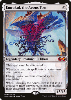 This spell can't be countered. When you cast this spell, take an extra turn after this one. Flying, protection from spells that are one or more colors, annihilator 6 When Emrakul is put into a graveyard from anywhere, its owner shuffles their graveyard into their library.
