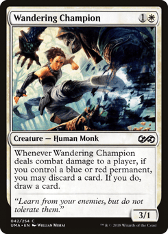 Whenever this creature deals combat damage to a player, if you control a blue or red permanent, you may discard a card. If you do, draw a card.