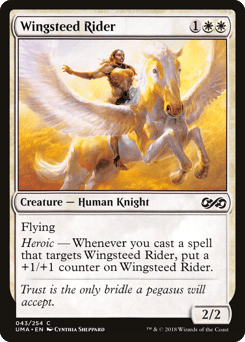 Flying Heroic — Whenever you cast a spell that targets this creature, put a +1/+1 counter on this creature.