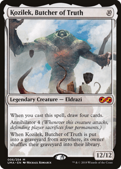 When you cast this spell, draw four cards. Annihilator 4 (Whenever this creature attacks, defending player sacrifices four permanents of their choice.) When Kozilek is put into a graveyard from anywhere, its owner shuffles their graveyard into their library.