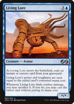 As this creature enters, exile an instant or sorcery card from your graveyard. Living Lore's power and toughness are each equal to the exiled card's mana value. Whenever this creature deals combat damage, you may sacrifice it. If you do, you may cast the exiled card without paying its mana cost.