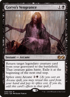 Return target legendary creature card from your graveyard to the battlefield. That creature gains haste. Exile it at the beginning of the next end step. Splice onto Arcane {2}{B} (As you cast an Arcane spell, you may reveal this card from your hand and pay its splice cost. If you do, add this card's effects to that spell.)