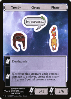 {TK}{TK} — Deathtouch {TK}{TK}{TK}{TK}{TK} — Whenever this creature deals combat damage to a player, create that many 1/1 green Squirrel creature tokens. {TK}{TK} — 5/1 {TK}{TK}{TK} — 3/6