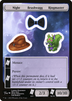 {TK}{TK} — Menace {TK}{TK}{TK} — Persist (When this permanent dies, if it had no -1/-1 counters on it, return it to the battlefield under its owner's control with a -1/-1 counter on it.) {TK}{TK} — 2/3 {TK}{TK}{TK}{TK}{TK}{TK} — 10/10