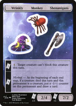 {TK}{TK} — {1}: Target creature can't block this creature this turn. {TK}{TK}{TK}{TK} — Morbid — At the beginning of each end step, if a creature died this turn and this permanent is a creature, put a -1/-1 counter on this permanent and draw a card. {TK}{TK} — 2/4 {TK}{TK}{TK} — 7/2