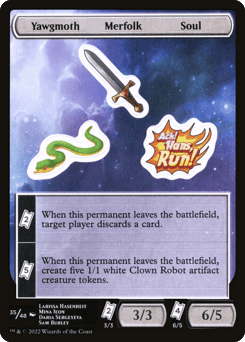 {TK}{TK} — When this permanent leaves the battlefield, target player discards a card. {TK}{TK}{TK}{TK}{TK} — When this permanent leaves the battlefield, create five 1/1 white Clown Robot artifact creature tokens. {TK}{TK} — 3/3 {TK}{TK}{TK}{TK} — 6/5