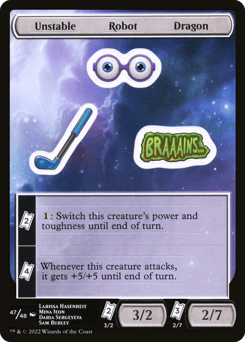 {TK}{TK} — {1}: Switch this creature's power and toughness until end of turn. {TK}{TK}{TK}{TK} — Whenever this creature attacks, it gets +5/+5 until end of turn. {TK}{TK} — 3/2 {TK}{TK}{TK} — 2/7