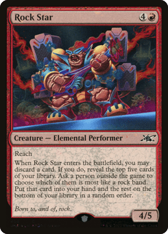 Reach When this creature enters, you may discard a card. If you do, reveal the top five cards of your library. Ask a person outside the game to choose which of them is most like a rock band. Put that card into your hand and the rest on the bottom of your library in a random order.