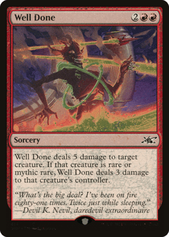 Well Done deals 5 damage to target creature. If that creature is rare or mythic rare, Well Done deals 3 damage to that creature's controller.