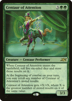 When this creature enters, roll five six-sided dice and store those results on it. At the beginning of combat on your turn, you may reroll any number of this creature's stored results. This creature gets +X/+X, where X is the greatest number of stored results on it of the same value.