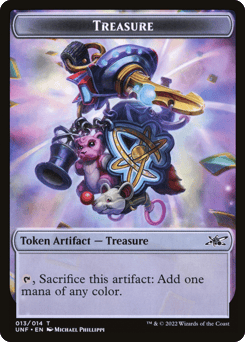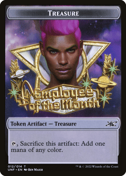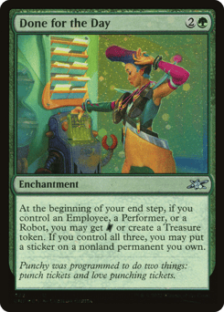 At the beginning of your end step, if you control an Employee, a Performer, or a Robot, you may get {TK} or create a Treasure token. If you control all three, you may put a sticker on a nonland permanent you own.