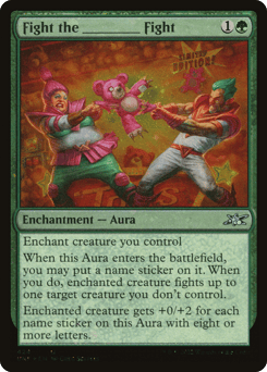 Enchant creature you control When this Aura enters, you may put a name sticker on it. When you do, enchanted creature fights up to one target creature you don't control. Enchanted creature gets +0/+2 for each name sticker on this Aura with eight or more letters.