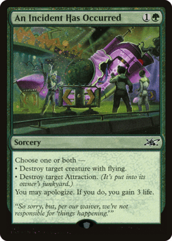 Choose one or both — • Destroy target creature with flying. • Destroy target Attraction. (It's put into its owner's junkyard.) You may apologize. If you do, you gain 3 life.
