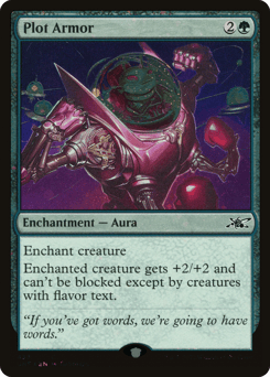 Enchant creature Enchanted creature gets +2/+2 and can't be blocked except by creatures with flavor text.