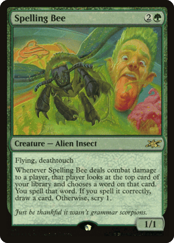 Flying, deathtouch Whenever this creature deals combat damage to a player, that player looks at the top card of your library and chooses a word on that card. You spell that word. If you spell it correctly, draw a card. Otherwise, scry 1.