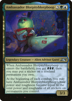 When Ambassador Blorpityblorpboop enters, you get {TK}{TK}{TK}, then you may put a sticker on a nonland permanent you own. At the beginning of each combat, you may have Ambassador Blorpityblorpboop's base power become equal to the total power of all stickers on permanents you control and its base toughness become equal to those stickers' total toughness.