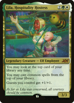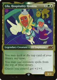 You may look at the top card of your library any time. You may cast common spells from the top of your library. Guests you control get +1/+1.