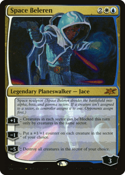 Space sculptor (Space Beleren divides the battlefield into alpha, beta, and gamma sectors. If a creature isn't assigned to a sector, its controller assigns it to one. Opponents assign first.) [+1]: Creatures in each sector can be blocked this turn only by creatures in the same sector. [−1]: Put a +1/+1 counter on each creature in the sector of your choice. [−5]: Destroy all creatures in the sector of your choice.