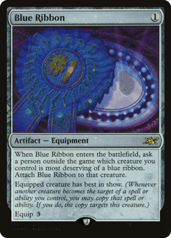 When this Equipment enters, ask a person outside the game which creature you control is most deserving of a blue ribbon. Attach this Equipment to that creature. Equipped creature has best in show. (Whenever another creature becomes the target of a spell or ability you control, you may copy that spell or ability. If you do, the copy targets this creature.) Equip {3}