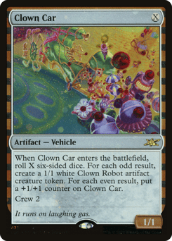 When this Vehicle enters, roll X six-sided dice. For each odd result, create a 1/1 white Clown Robot artifact creature token. For each even result, put a +1/+1 counter on this Vehicle. Crew 2