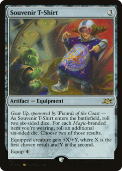 Gear Up, sponsored by Wizards of the Coast — As this Equipment enters, roll two six-sided dice. For each Magic-branded item you're wearing, roll an additional six-sided die. Choose two of those results. Equipped creature gets +X/+Y, where X is the first chosen result and Y is the second. Equip {4}