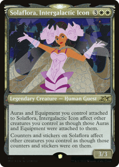 Auras and Equipment you control attached to Solaflora, Intergalactic Icon affect other creatures you control as though those Auras and Equipment were attached to them. Counters and stickers on Solaflora affect other creatures you control as though those counters and stickers were on them.