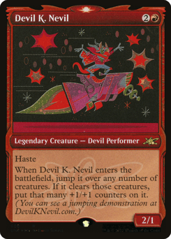 Haste When Devil K. Nevil enters, jump it over any number of creatures. If it clears those creatures, put that many +1/+1 counters on it. (You can see a jumping demonstration at DevilKNevil.com.)