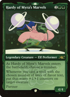 As Hardy of Myra's Marvels enters, choose a number. Whenever you cast a spell with the chosen number of lines of flavor text, put that many +1/+1 counters on target creature. Partner (You can have two commanders if both have partner.)