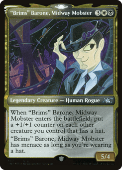 When "Brims" Barone, Midway Mobster enters, put a +1/+1 counter on each other creature you control that has a hat. "Brims" Barone, Midway Mobster has menace as long as you're wearing a hat.