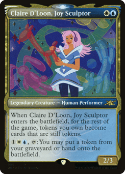 When Claire D'Loon, Joy Sculptor enters, for the rest of the game, tokens you own become cards that are still tokens. (They continue to exist after they leave the battlefield.) {1}{W}{U}, {T}: You may put a token from your graveyard or hand onto the battlefield.