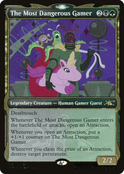 Deathtouch Whenever The Most Dangerous Gamer enters or attacks, open an Attraction. Whenever you open an Attraction, put a +1/+1 counter on The Most Dangerous Gamer. Whenever you claim the prize of an Attraction, destroy target permanent.