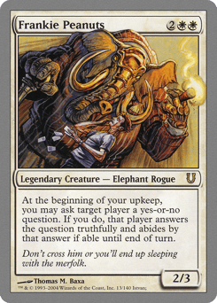 At the beginning of your upkeep, you may ask target player a yes-or-no question. If you do, that player answers the question truthfully and abides by that answer if able until end of turn.