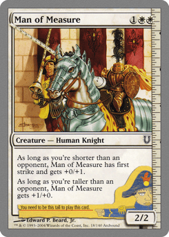 As long as you're shorter than an opponent, Man of Measure gets +0/+1 and has first strike. As long as you're taller than an opponent, Man of Measure gets +1/+0.