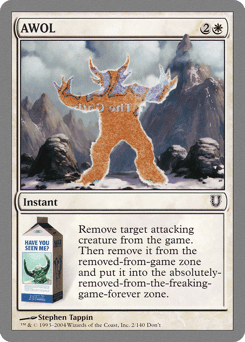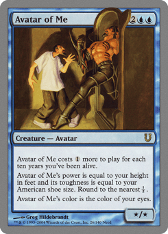 This spell costs {1} more to cast for each ten years you've been alive. Avatar of Me's power is equal to your height in feet and its toughness is equal to your American shoe size. Round to the nearest ½. Avatar of Me is the color of your eyes.