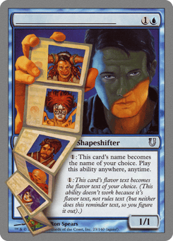 {2}: This creature gains your choice of banding, bushido 1, double strike, fear, flying, first strike, haste, landwalk of your choice, protection from a color of your choice, provoke, rampage 1, shadow, or trample until end of turn. {2}: This creature becomes the colors of your choice until end of turn. {2}: This creature becomes the creature type of your choice until end of turn. {2}: This creature's expansion symbol becomes the symbol of your choice until end of turn. {2}: This creature's art becomes by the artist of your choice until end of turn. {2}: This creature gets +2/-2 or -2/+2 until end of turn. {2}: Untap this creature.