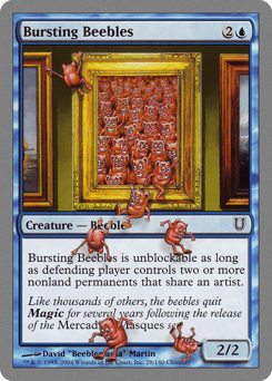 This creature can't be blocked as long as defending player controls two or more nonland permanents that share an artist.
