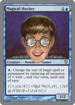 {U}: Change the text of target spell or permanent by replacing all instances of + with -, and vice versa, until end of turn.