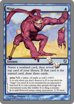 Choose a nonland card name, then reveal the top card of your library. If that card has the chosen name, you draw three cards.