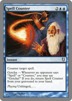 Counter target spell. Gotcha — If an opponent says "spell" or "counter," you may say "Gotcha!" When you do, return Spell Counter from your graveyard to your hand.