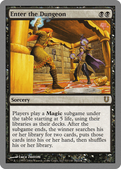 Players play a Magic subgame under the table, starting at 5 life and using their libraries as their decks. The winner searches their library for two cards, puts those cards into their hand, then shuffles.