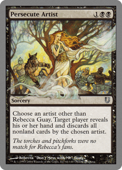 Choose an artist other than Rebecca Guay. Target player reveals their hand and discards all nonland cards with art by the chosen artist.