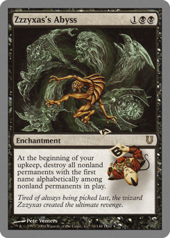 At the beginning of your upkeep, destroy all nonland permanents with the first name alphabetically among nonland permanents.