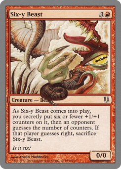 As this creature enters, you secretly put six or fewer +1/+1 counters on it, then an opponent guesses the number of counters. If that player guesses right, sacrifice this creature after it enters.
