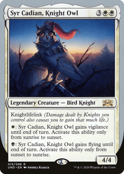 Knightlifelink (Damage dealt by Knights you control also causes you to gain that much life.) {W}: Syr Cadian gains vigilance until end of turn. Activate only from sunrise to sunset. {B}: Syr Cadian gains flying until end of turn. Activate only from sunset to sunrise.