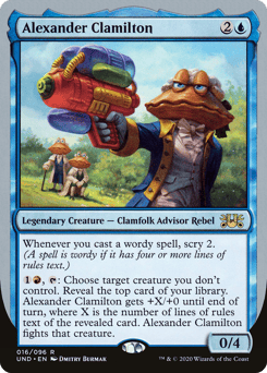 Whenever you cast a wordy spell, scry 2. (A spell is wordy if it has four or more lines of rules text.) {1}{R}, {T}: Choose target creature you don't control. Reveal the top card of your library. Alexander Clamilton gets +X/+0 until end of turn, where X is the number of lines of rules text of the revealed card. Alexander Clamilton fights that creature.